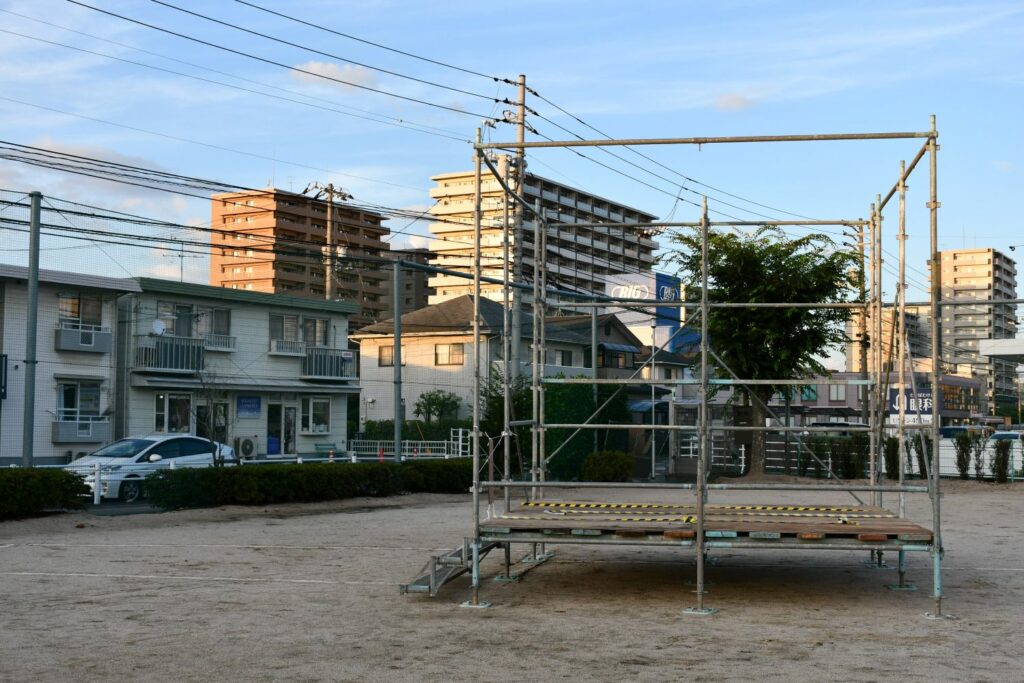 ステージとやぐらは業者委託。前日迄に設置完了。