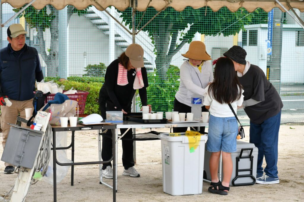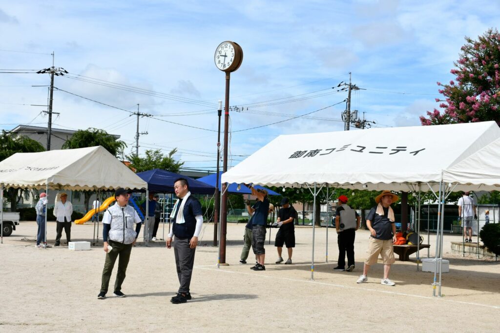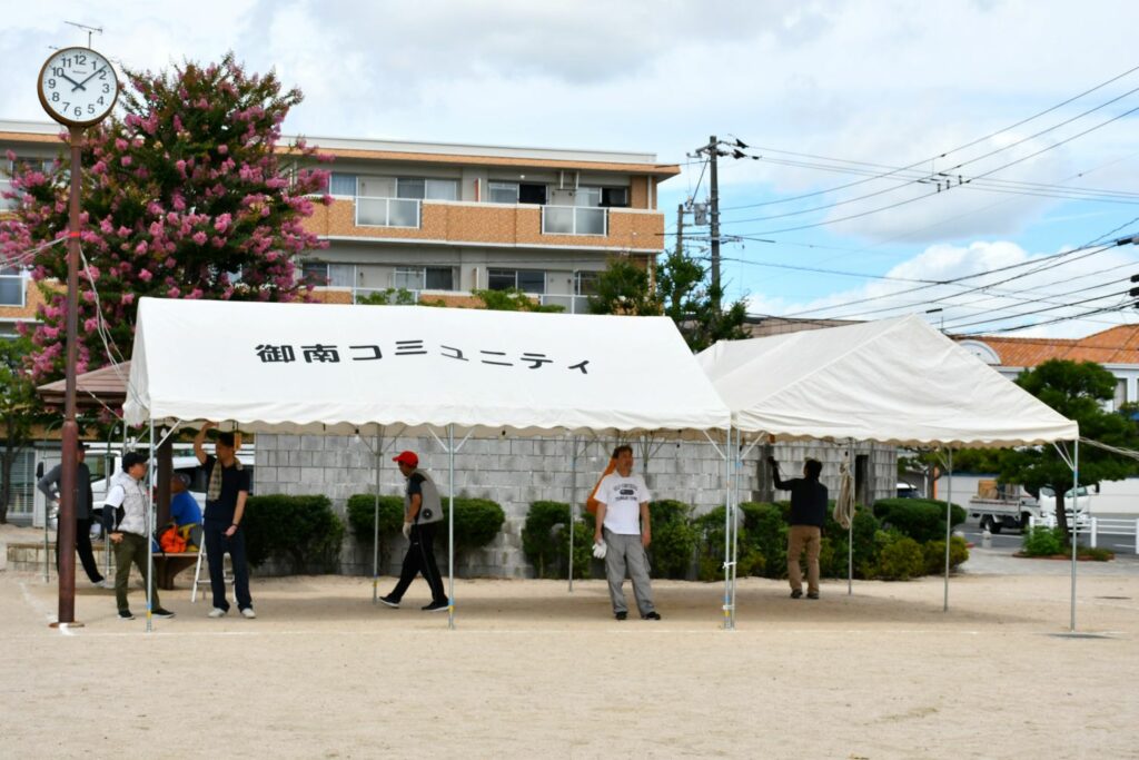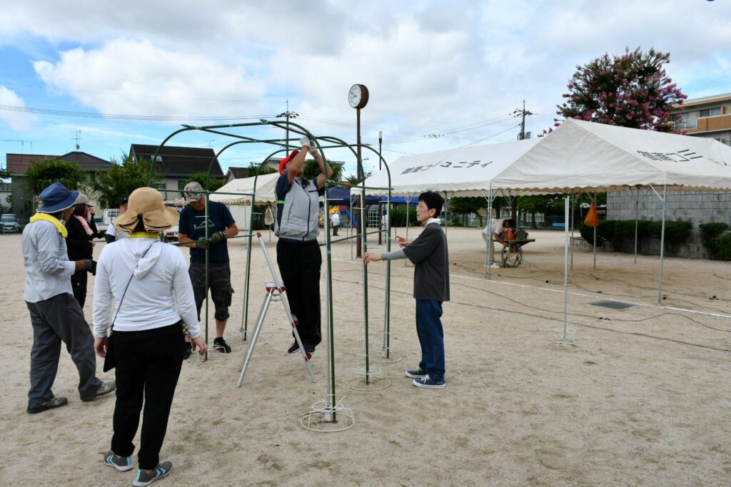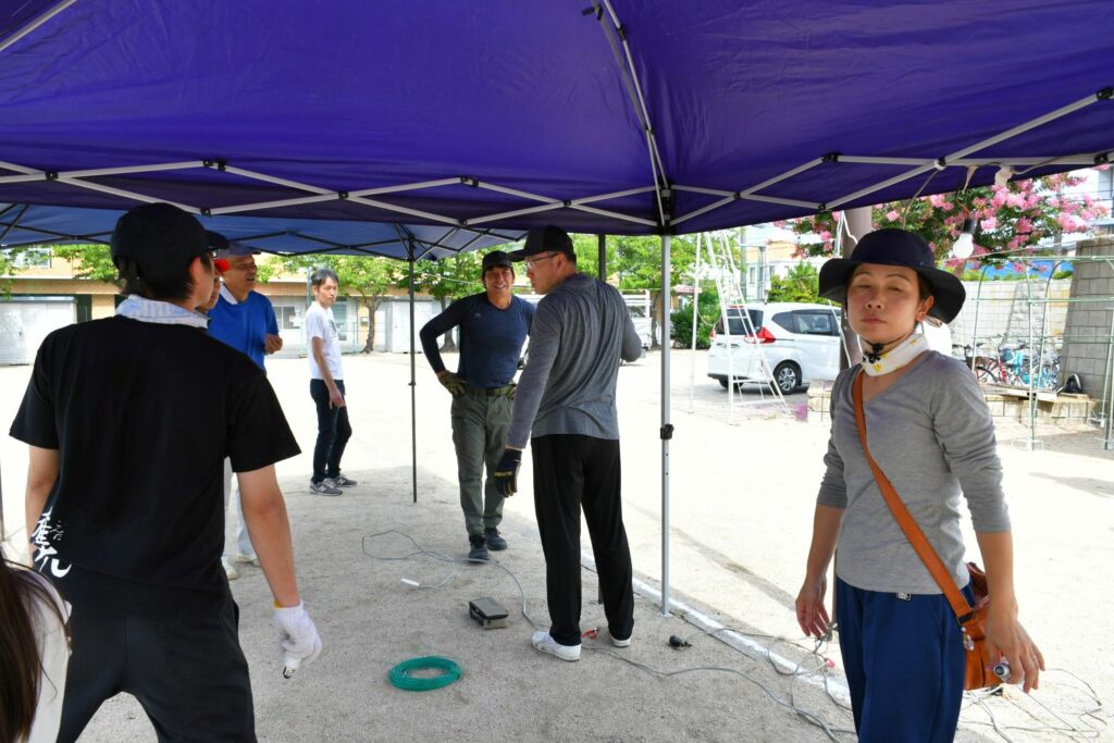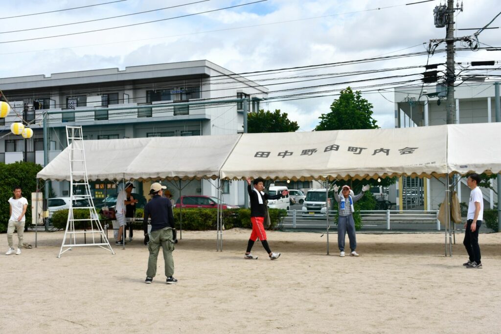 7月20日(日)辰巳西公園(田中野田グラウンド)でテント等を設営しました。公会堂からの資材搬出など8時集合より早く作業して下さる方、初めての方も含め40名を超える方々がご協力くださいました。ありがとうございます。スポーツドリンクなど水分補給と休憩を入れながら安全第一で!設営の様子をご紹介します。