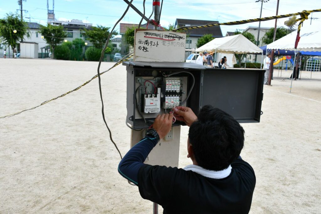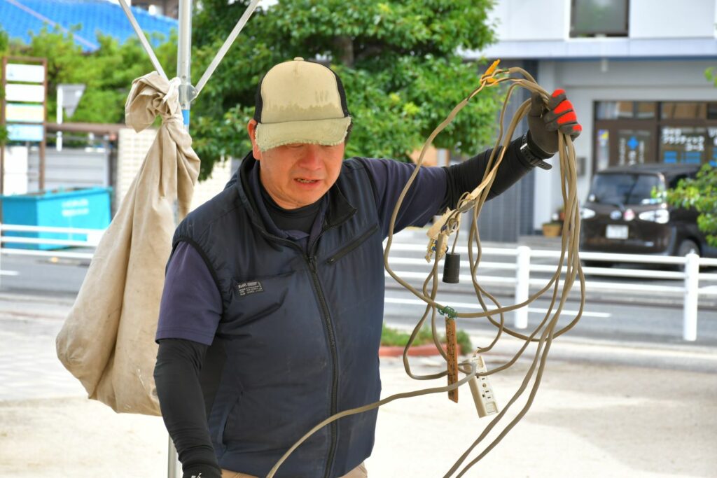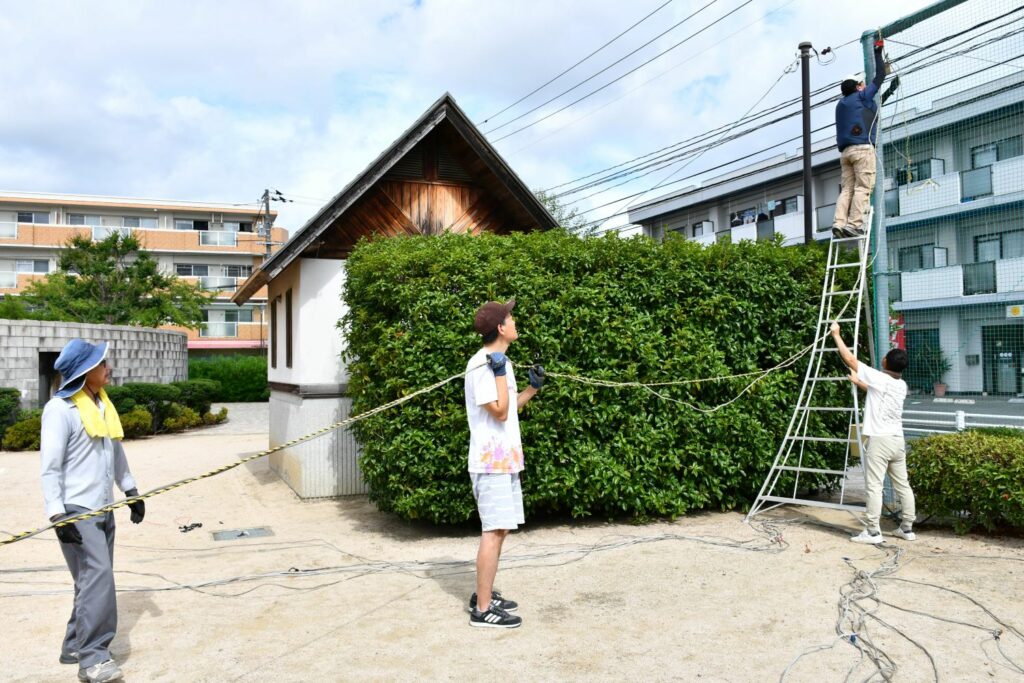 電気配線は資格者2名が手際よくしてくださいました。頼もしい!提灯が張られると雰囲気が出ますね。