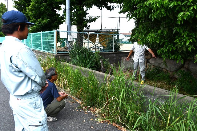 石碑の南側を候補にあげ、野殿事業所の職員の方にもお越しいただいて場所の条件など打合せしました。