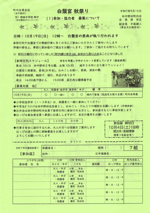 白鬚宮の秋祭りに参加・ご協力頂ける方を募集します。