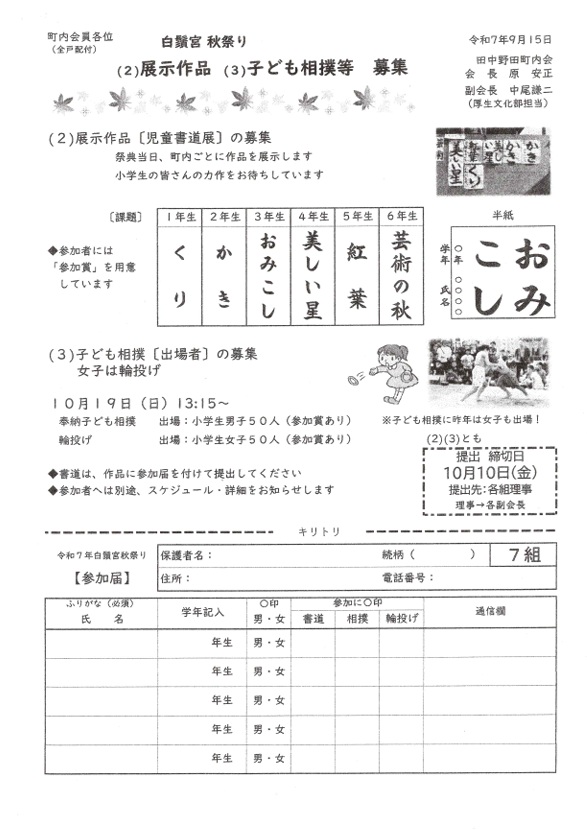 (2)は10月10日が締切です。書道作品を出されるお子さんは届に作品を添えて提出ください。