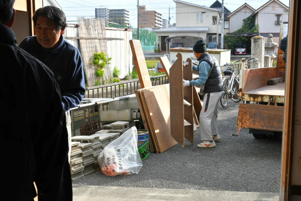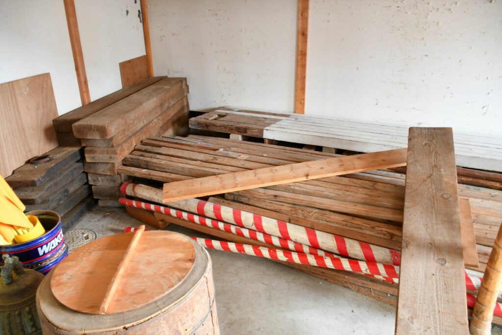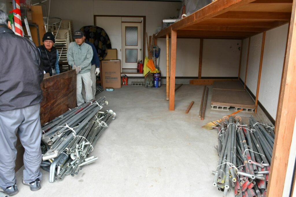公会堂倉庫内の整理を進めています。すでに処分したものもありますが、この日は大量の木材類に取り掛かることになりました。