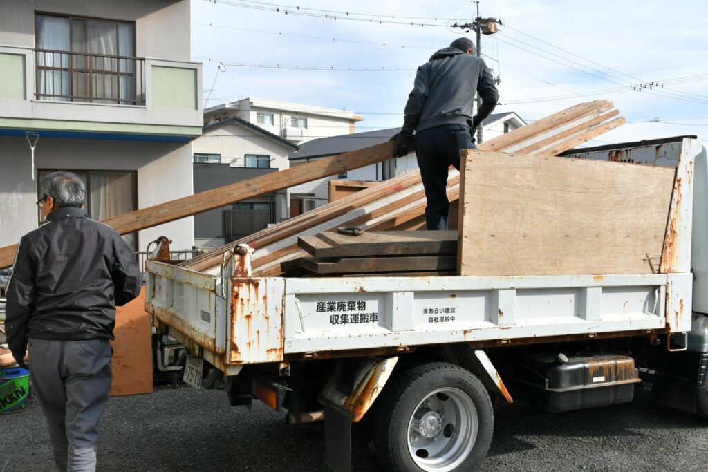夏祭りで組み立てていたステージややぐら等の部材、何十年も置きっぱなしにされている使い道の分からない木材など建築会社に産廃処分を依頼し、みんなで積込みました。トラックいっぱいになったのでびっくりです!