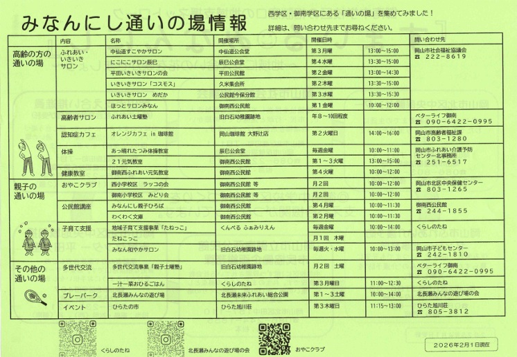 「すまいるみなんにし」は令和8年3月に回覧しています。毎月の回覧板には地域づくりや参加募集の内容物が入っていますが、このチラシは西学区・御南学区にある「通いの場」が一覧表としてまとめてあります。