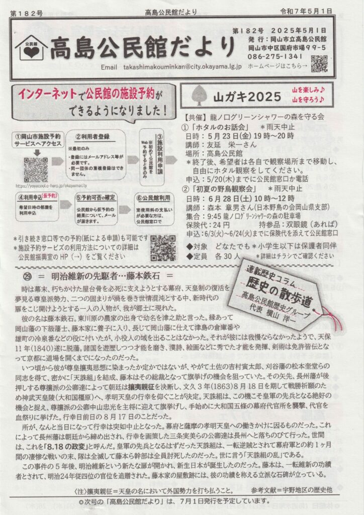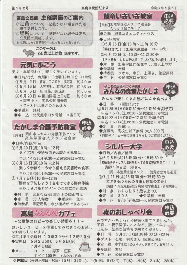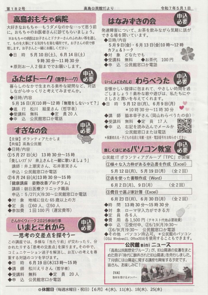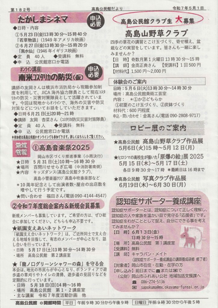 高島公民館だより第182号 2025年5月1日 が発行されました。