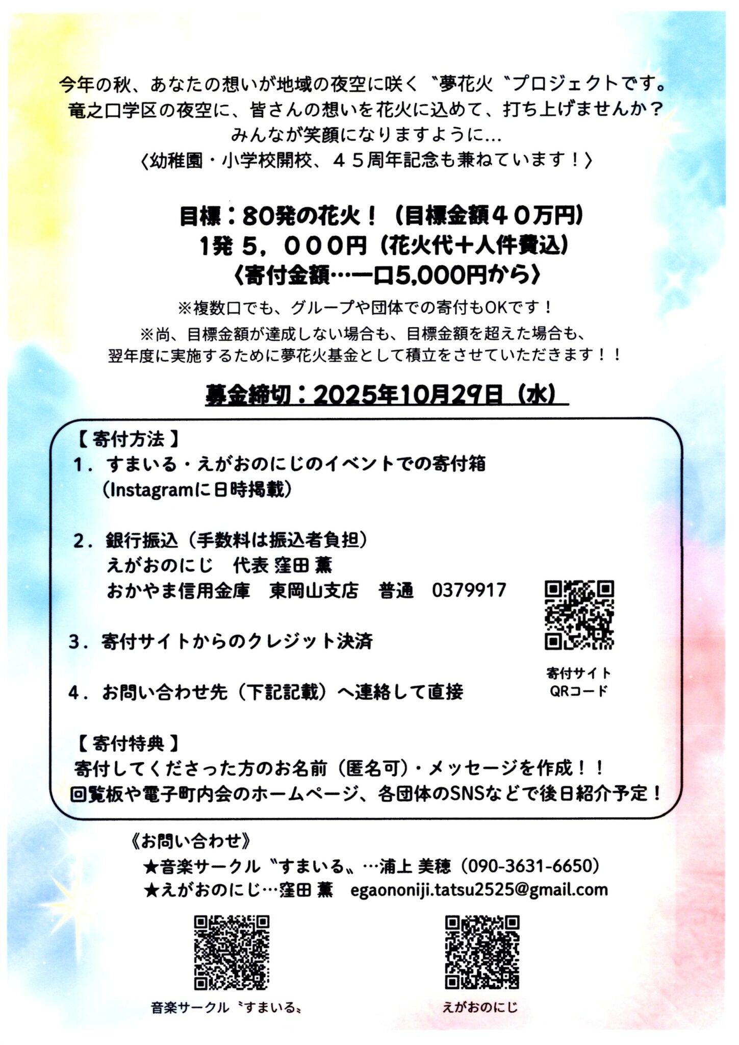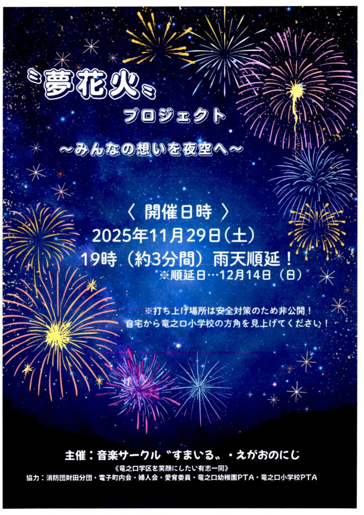 竜之口学区に花火があがります。 【夢花火】~みんなの想いを夜空へ~ 投稿日:2025年10月3日 竜之口学区のどこかから 2025年11月29日(土)19時から花火をあげるイベントがあります。詳細は添付のチラシをご覧ください。このチラシは学区の各町内会を通して、回覧もしております。ご期待ください。 夢花火へ寄付の募集を行っています。チラシを参考のうえ 皆さんのご協力をお願いします。 カテゴリー:えがおのにじ お知らせ ギャラリー ふれあい21クラブ 地域の和 地域交流会 音楽サークルすまいる