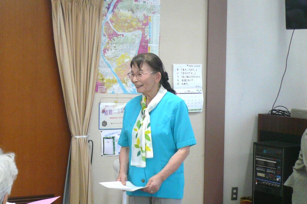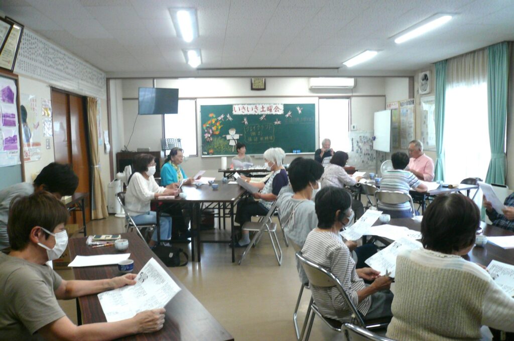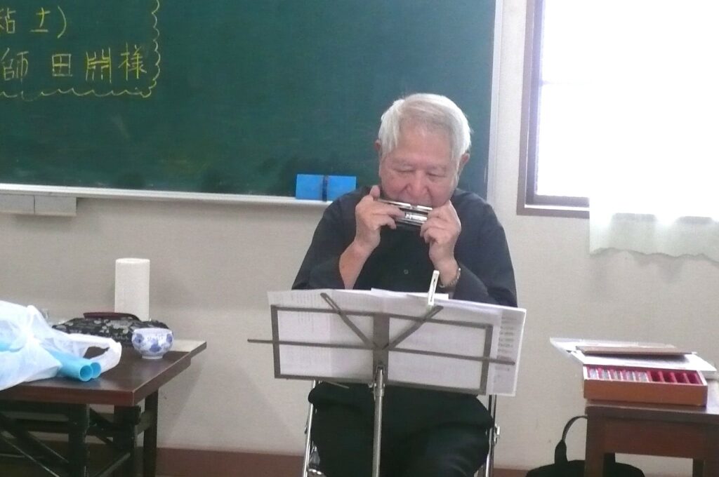 いきいき土曜会の始まりは、いつもと同じ、因来さんの、ハーモニカ演奏に合わせて参加者全員で歌唱、今回も6曲、元気に大きな声で楽しく歌いました。