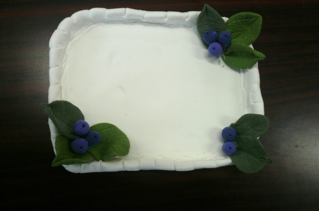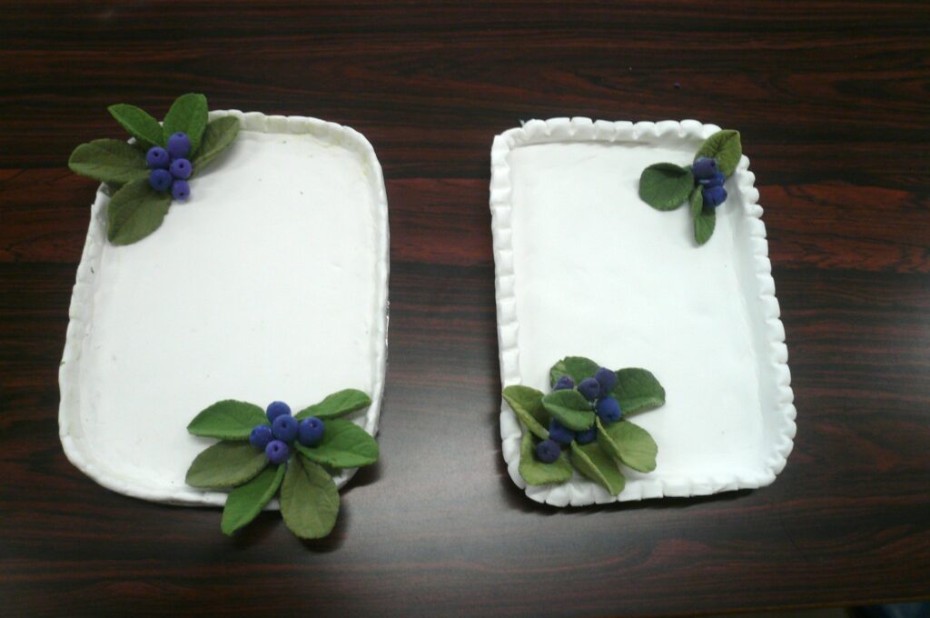 (小物入れ・ブルーベリー・木の葉)を手作り、ボンドで固定して完成です。