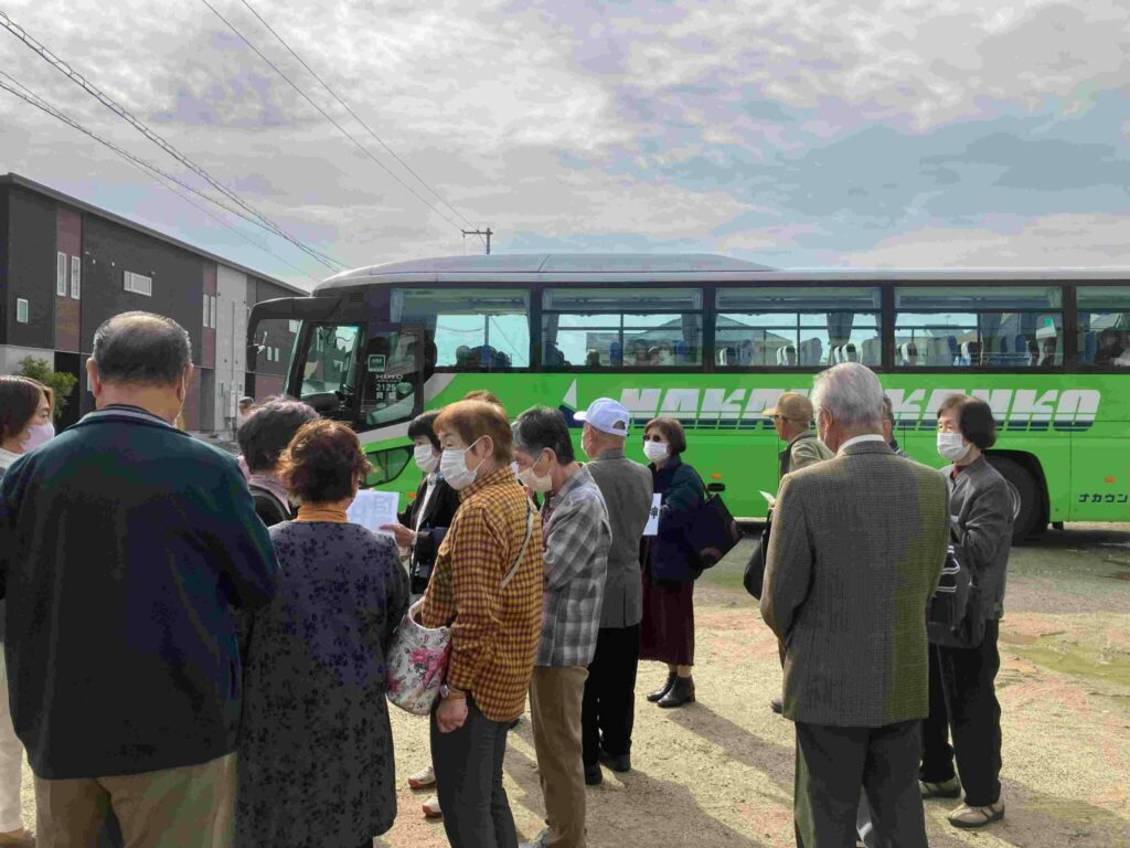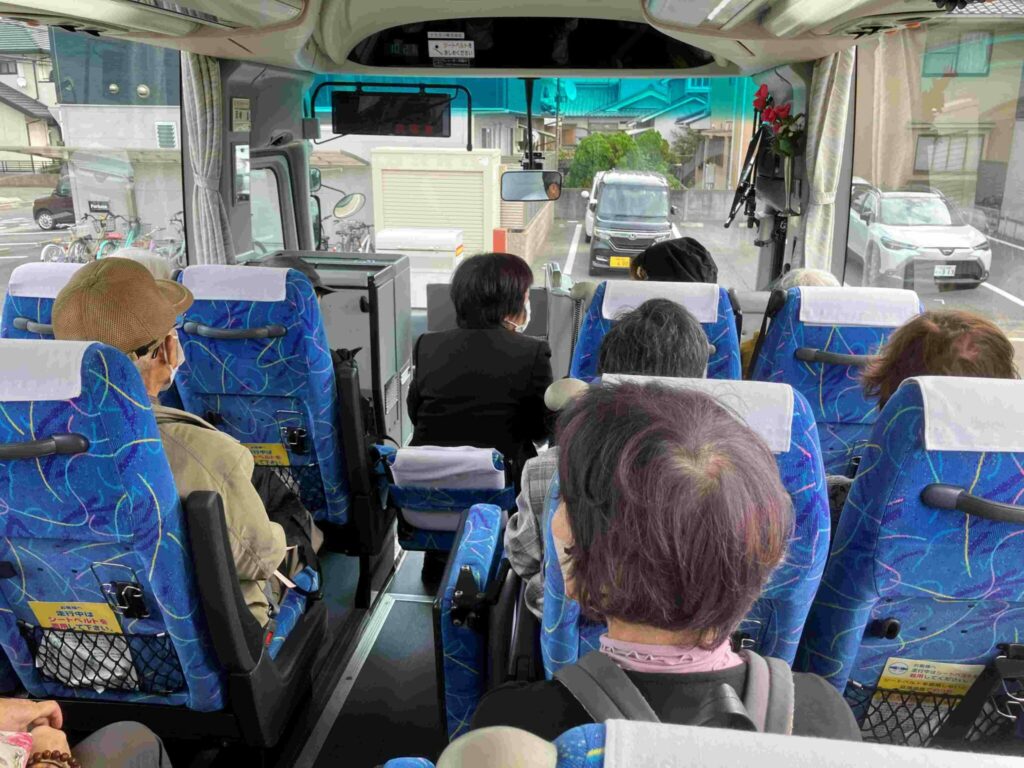 皆さん、学区の集合場所に集まり大型バスで会場の岡山桃太郎温泉に向かいました。話をながら楽しそうに。