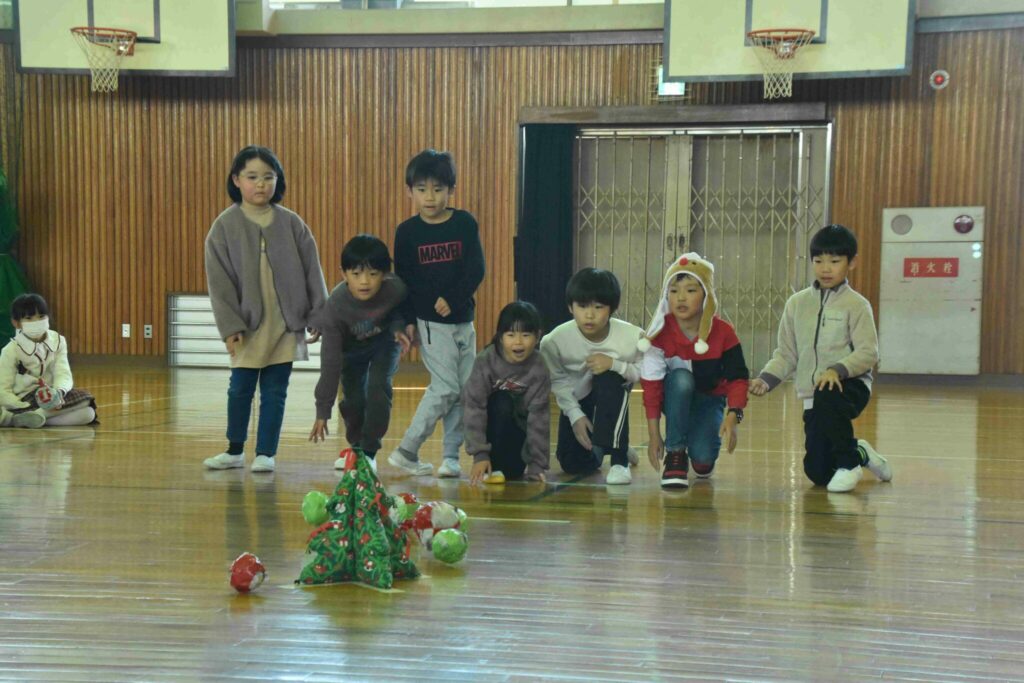 まず、ゲームから始まりました。樅の木に見立てた、まとにどれだけ近くまでボールを投げて近ずけられるかな。