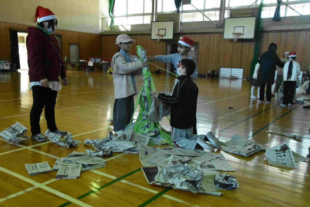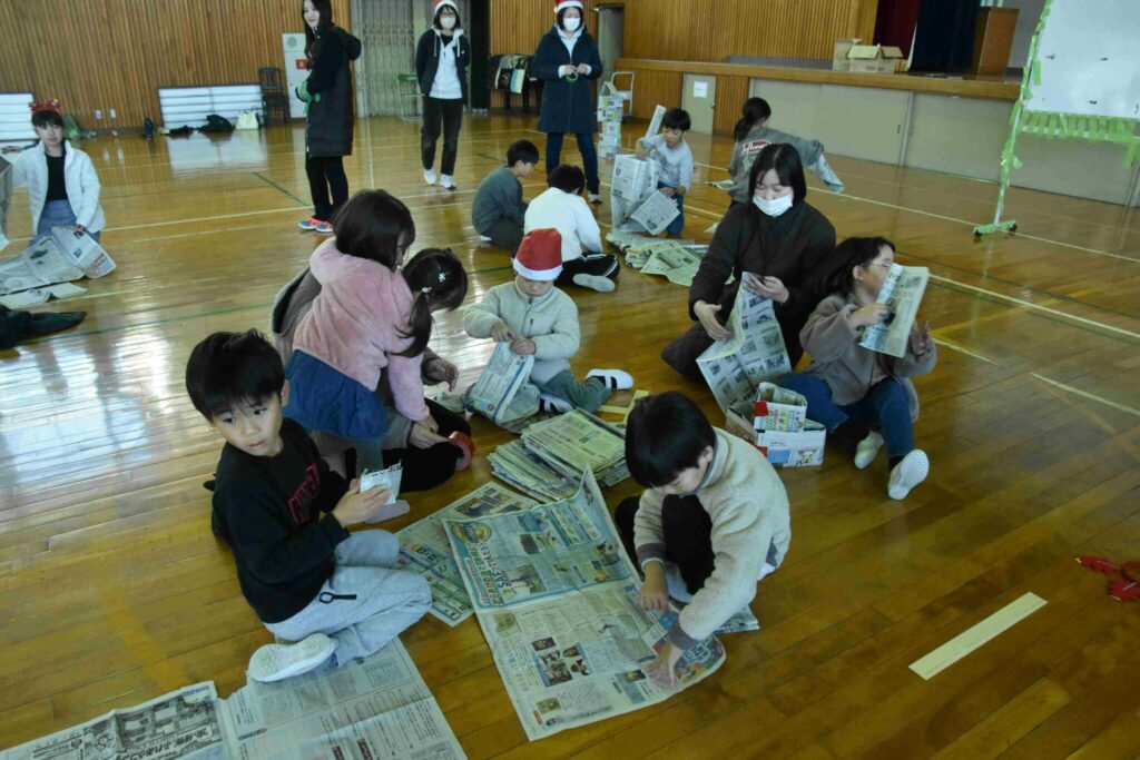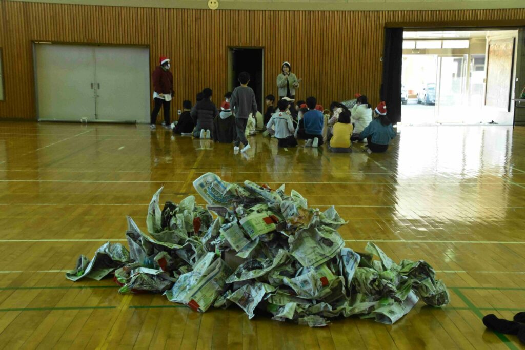 次は新聞紙を工夫して、タワーに挑戦。何班かに分かれ、どのチームが一番高く作れるかな。終わった後は、新聞紙の残材の山。誰が、こんな素晴らしいゲームを考えたのしょうか。