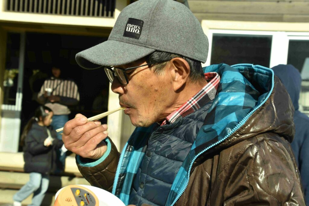 ついた餅は熱々のまま、その場で、あんこ、きな粉、おろし大根など好みに応じて参加の皆さんに配っていました。会長さんも美味しそうに。