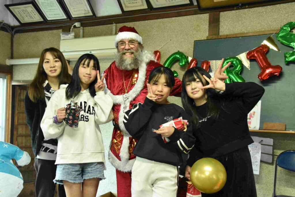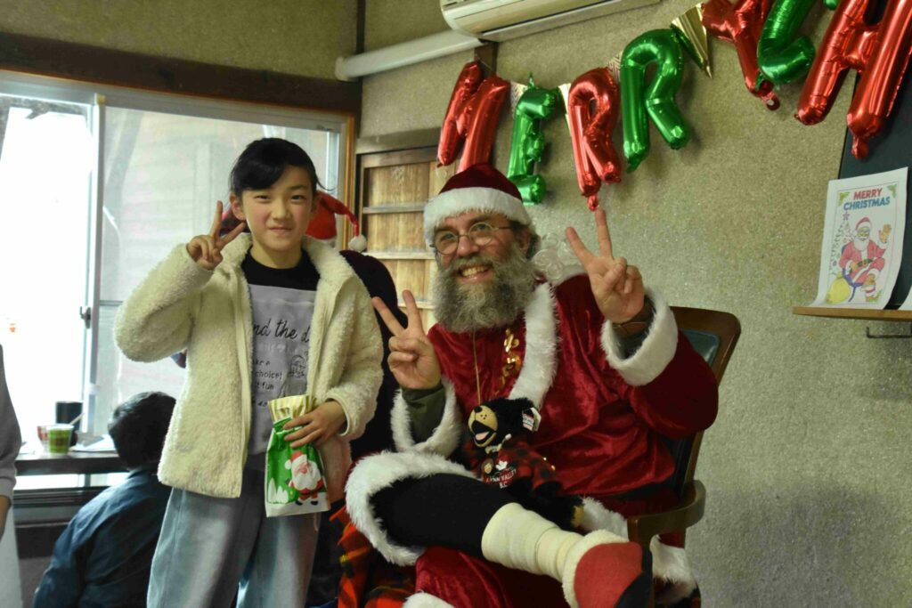 最後に、サンタさんからおみやげ(クリスマスプレゼント)をいただきました。そして、サンタさんと記念撮影。全員撮りましたが、ここではそのうち2枚を紹介しました。