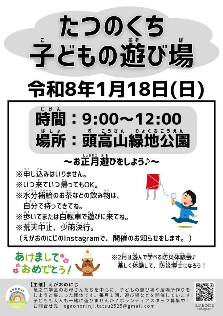 1月の子どもの遊び場 投稿日:2026年1月8日 明けましておめでとうございます🎍今年もどうぞよろしくお願いします。2026年のスタートは、1月18日(日)9時〜12時 頭高山で子どもの遊び場!寒さを吹っ飛ばして遊ぼう😆大人も子どもも一緒にお正月遊びをしてみませんか?お待ちしています♪ カテゴリー:えがおのにじ お知らせ 元気な子育て 子どもの遊び場