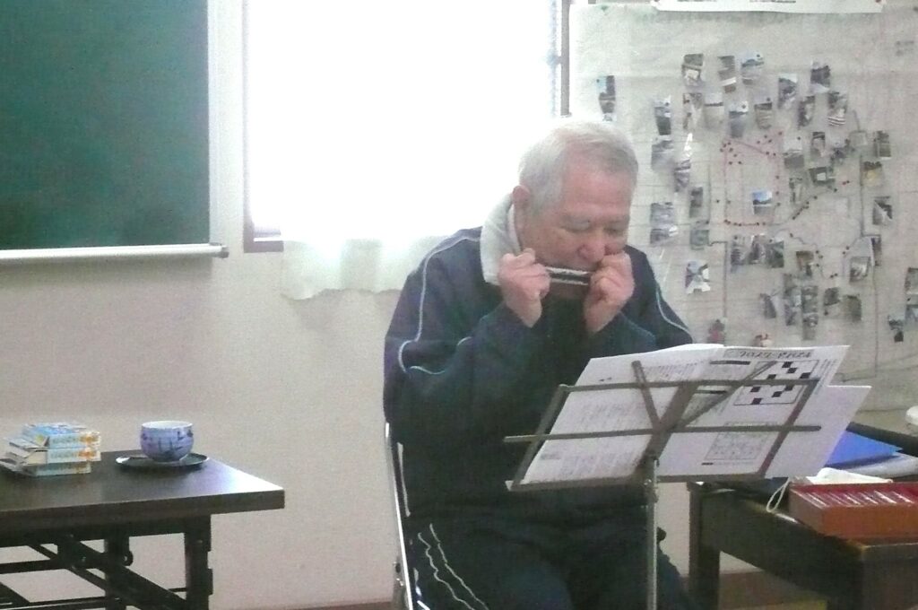 いきいき土曜会の始まりは、いつもと同じ、因来さんの、ハーモニカ演奏に合わせて