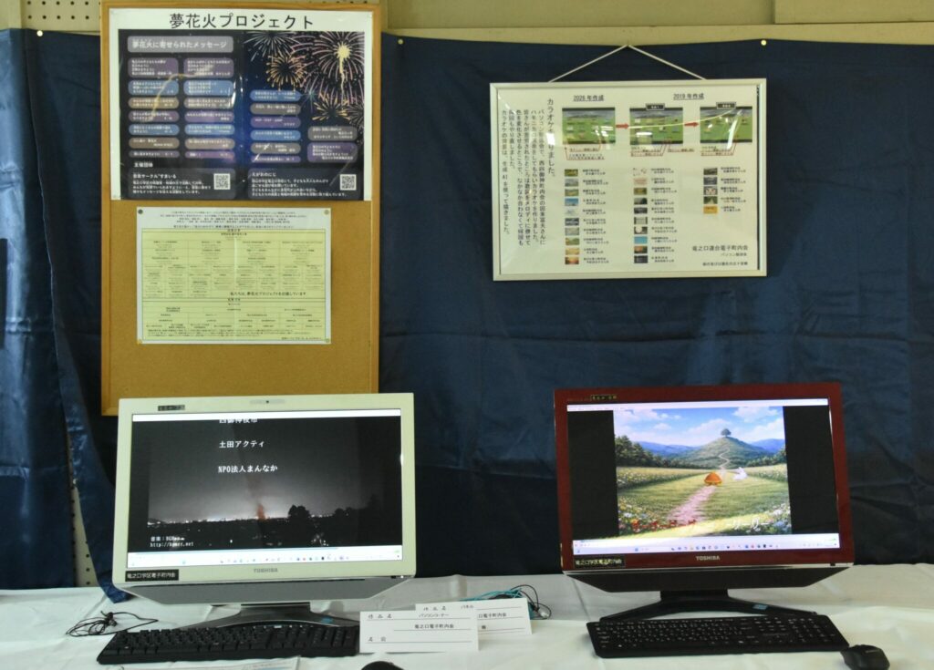 パネル、パソコンコーナー。昨年の夢花火の御礼、カラオケ作品の紹介など、竜之口電子町内会
