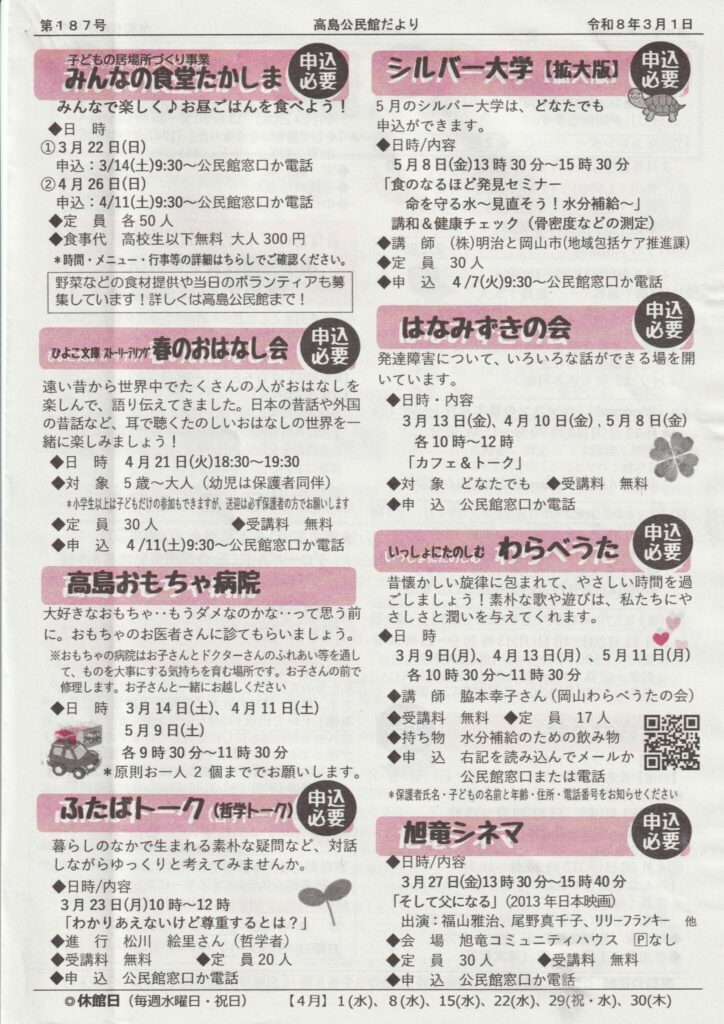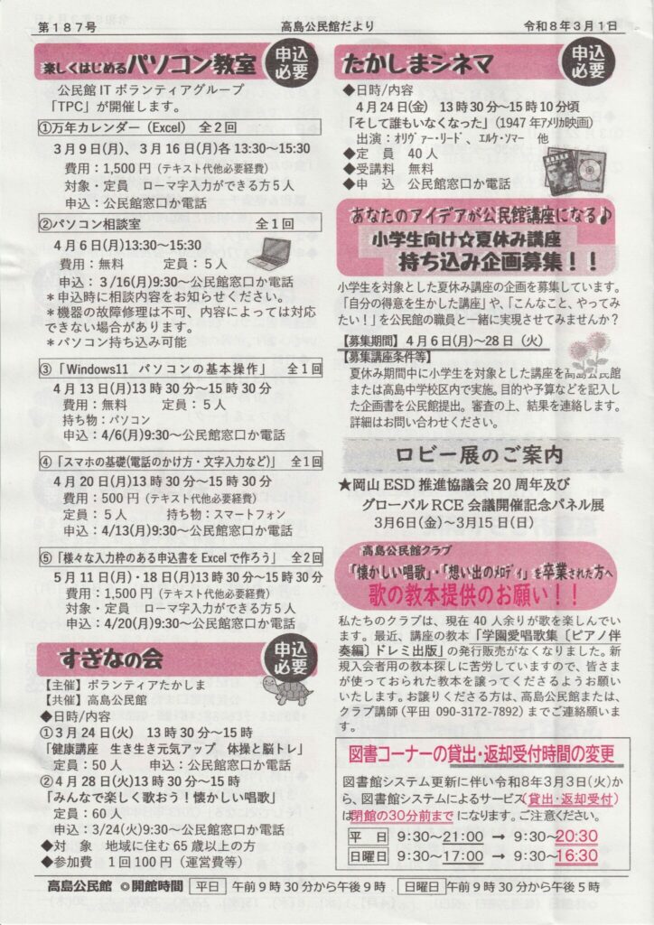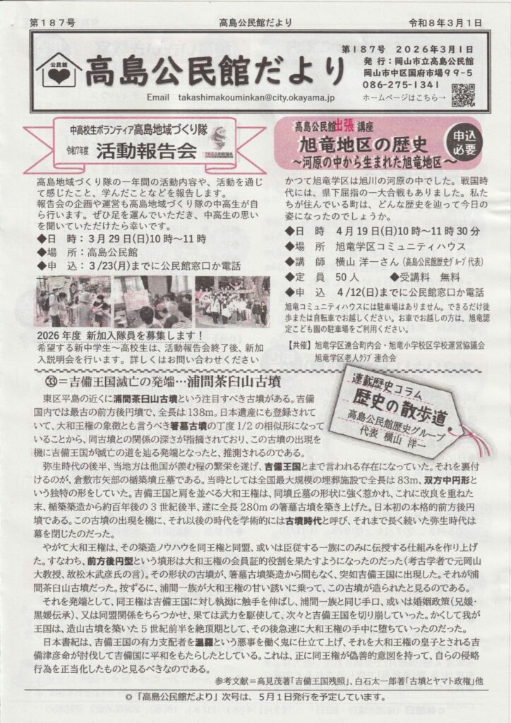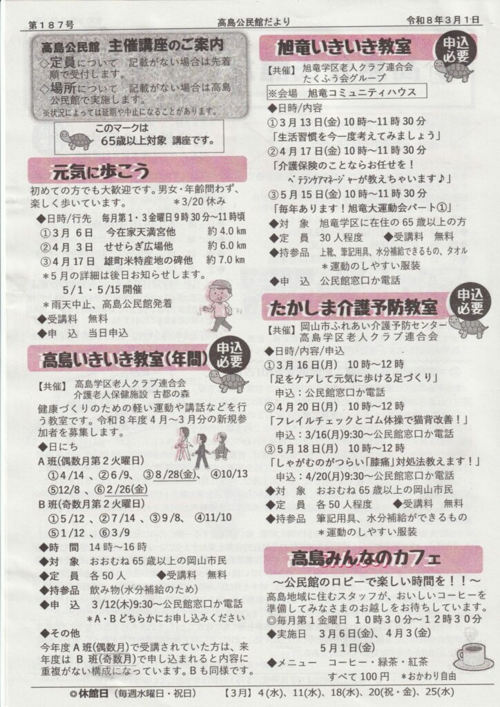 高島公民館だより 第187号(2026年3月1日)が発行されました。