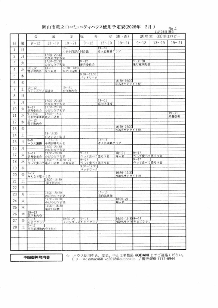竜之口コミュニティハウスの11月~12月の使用予定です。
