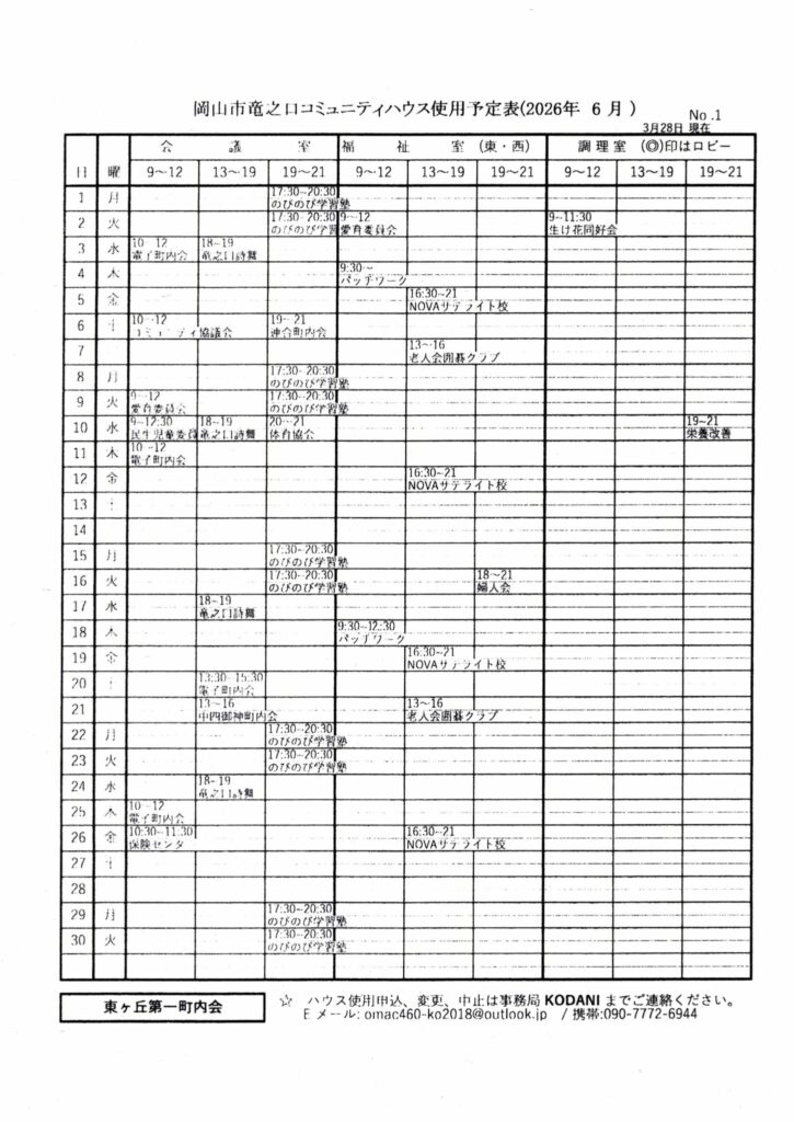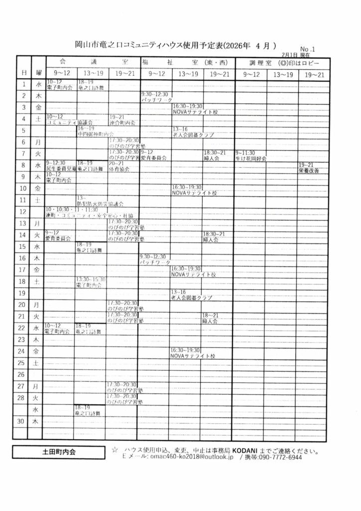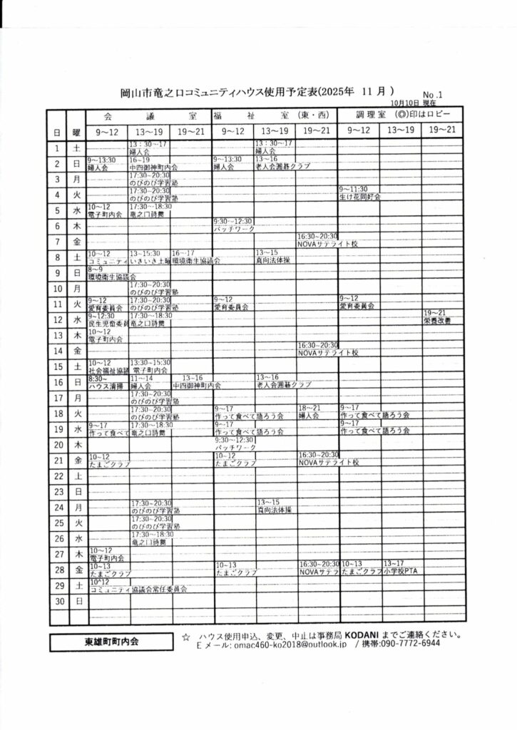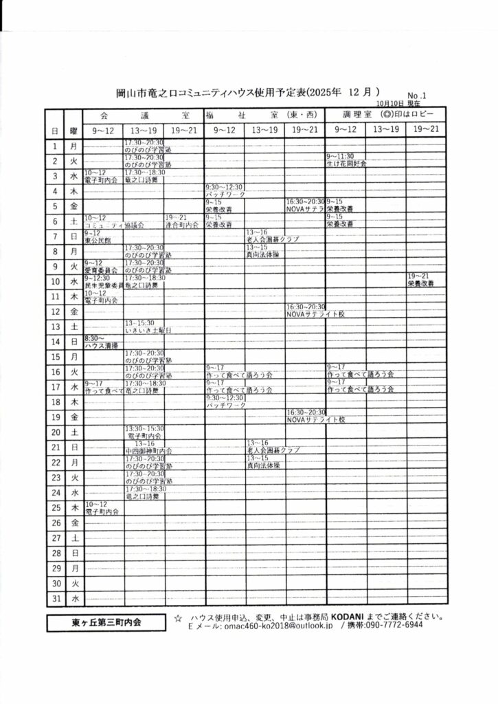 竜之口コミュニティハウスの11月~12月の使用予定です。