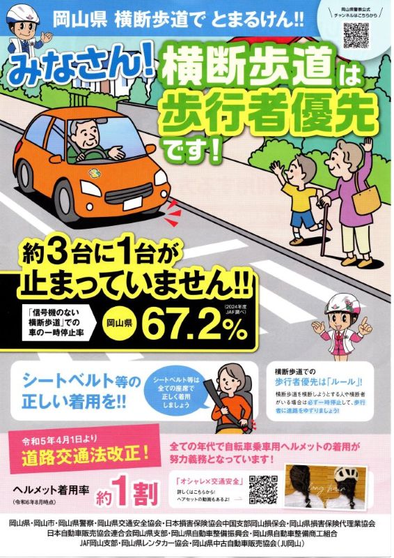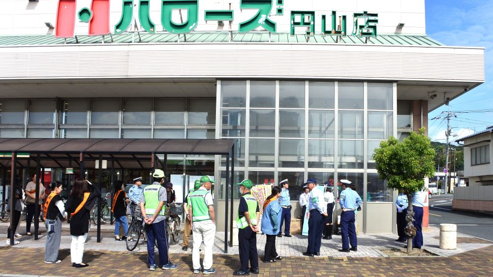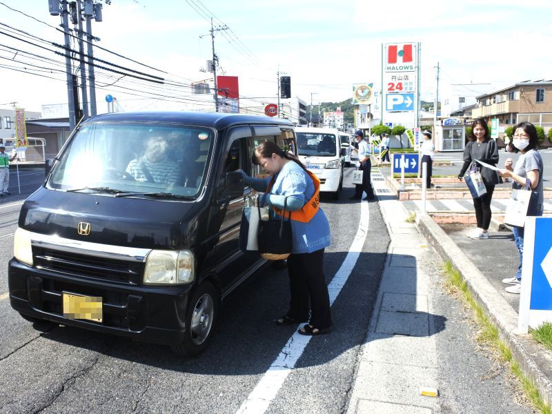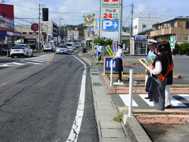秋の交通安全市民運動の一環として交通安全街頭啓発活動が9月24日(水)午前10時から、ハローズ円山店前及び県道28号線(岡山牛窓線)にて行われました。