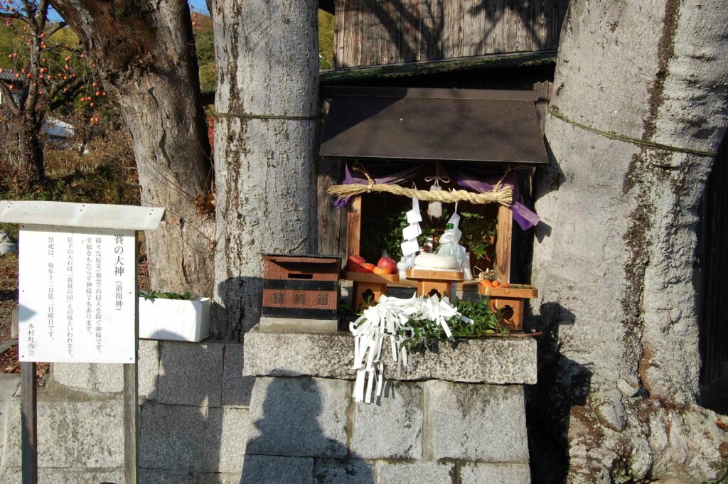 早朝の雨も上がり、陽射しはあるものの、風の強い寒い朝です。注連縄やわらじは新調され、野菜や果物、お餅や御神酒もお供えされています。町内会役員の方々が、昨日から準備されていました。