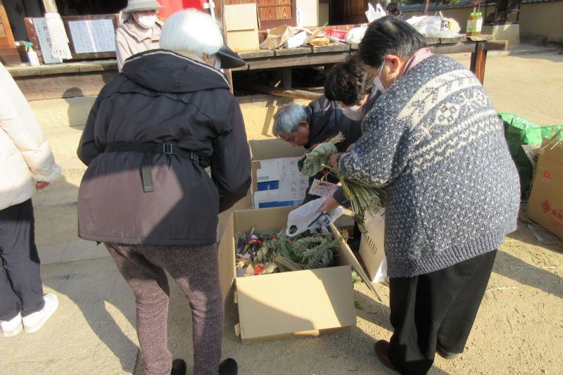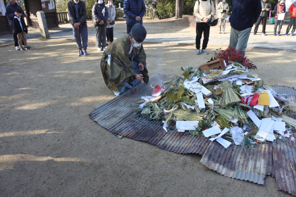 “どんどまつり”の祝詞奏上の後、ボランティアの手で針金などを取り除いた注連飾りが境内中央に積まれました。