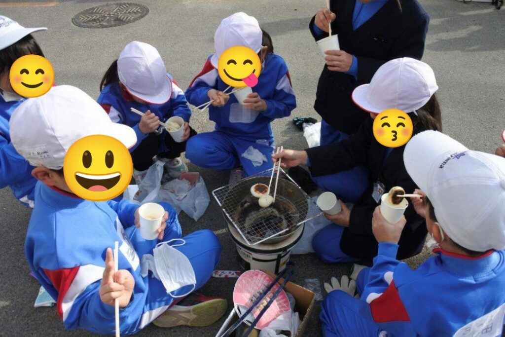焼けた餅を紙コップに入れ、醤油をつけて「おいしい!おいしい!」と言いながらみんなで食べました。そして全員で後片付けをして“終わりの会”を行い、ボランティアに昔の生活の様子を質問していました。