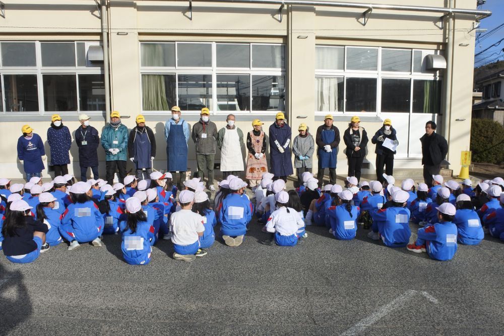 この授業は社会科で学習している「昔の暮らし」を実際に体験することの一環として行われている授業支援で、地域からは福森和子さんを中心に15名のボランティアが協力しました。