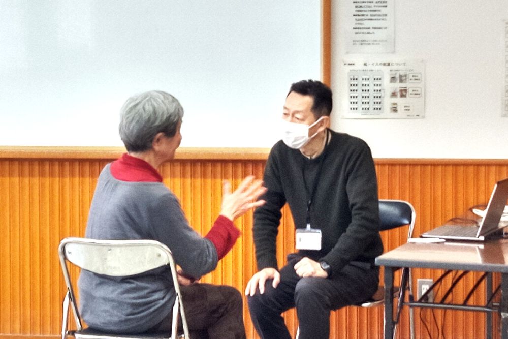 参加者一同が歌や詩の朗読、民話の語りやコミュニケーションゲーム、脳トレ体操などを楽しみましたが、その間も中村講師は、会場の一角で希望参加者の足裏圧力測定や身体の重心測定をし、歩き方や姿勢、使用中の靴等に関する様々な相談に応じ、忠告・指導をしてくれました。