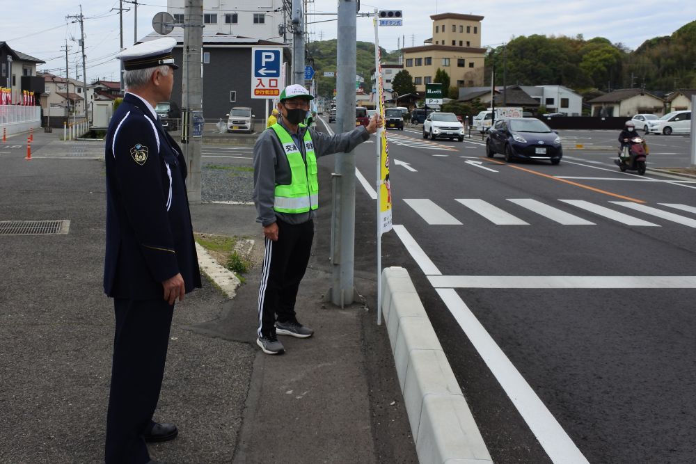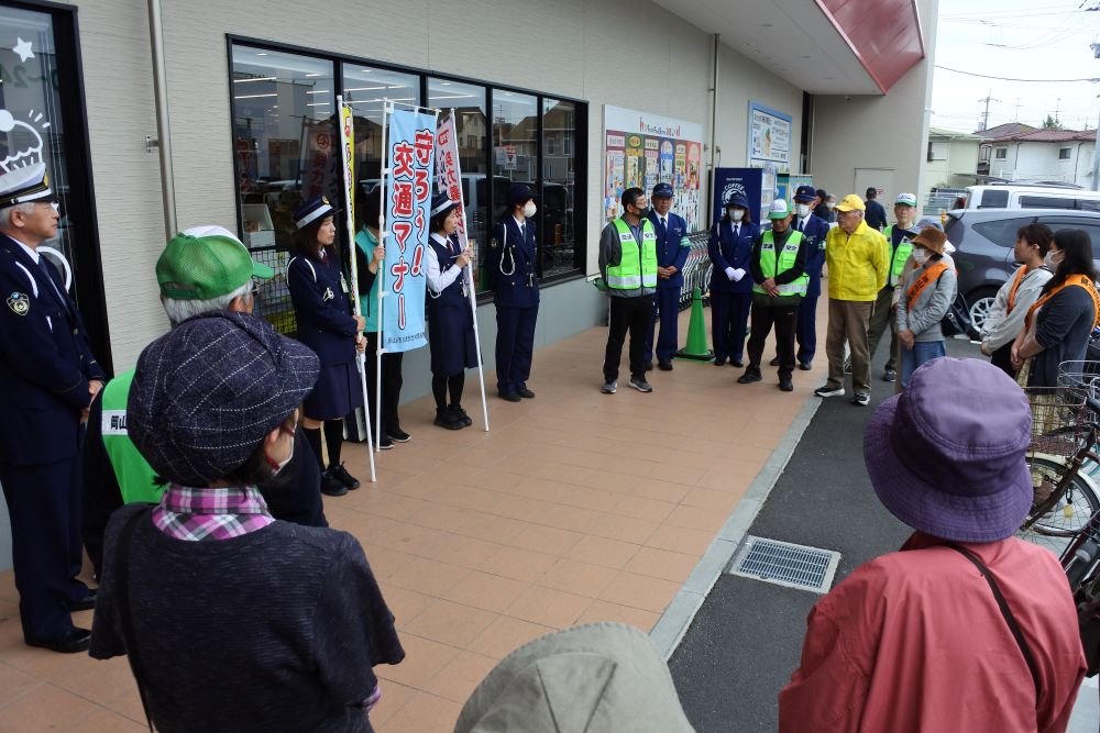 岡山中央警察署の羽場交通官をはじめ、警察官・交通警察協助員・シルバーセーフティサポーター・岡山市の交通指導員の皆様、そして学区からは連合町内会・交通安全対策協議会・交通安全母の会・老人クラブの方々の参加を得て行われました。