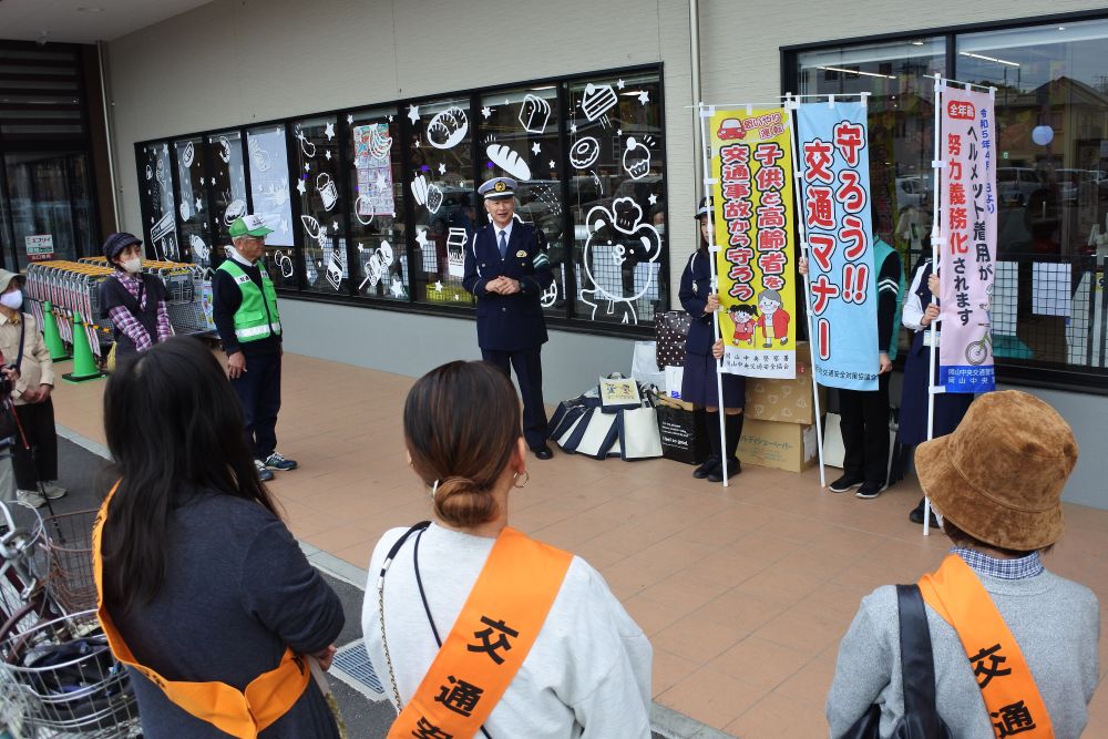 春の交通安全市民運動期間(4月6日~15日)中の4月13日(月)午前10時30分から、エブリィ円山店前に於いて交通安全街頭啓発運動が行われました。