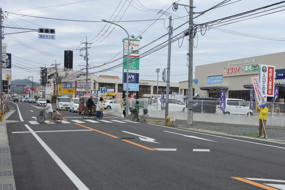 参加者は啓発グッズを手に買い物客に交通安全を訴え、またある人はハンドポップを手に店舗前の県道28号線(岡山-牛窓線)を通行する車に交通安全を訴えていました。