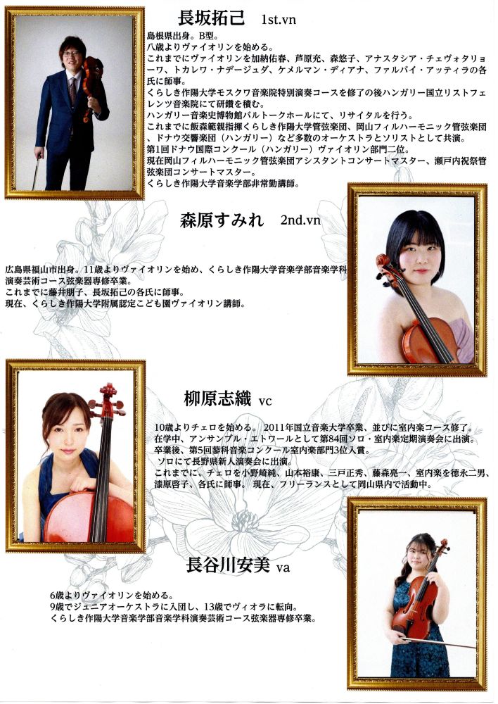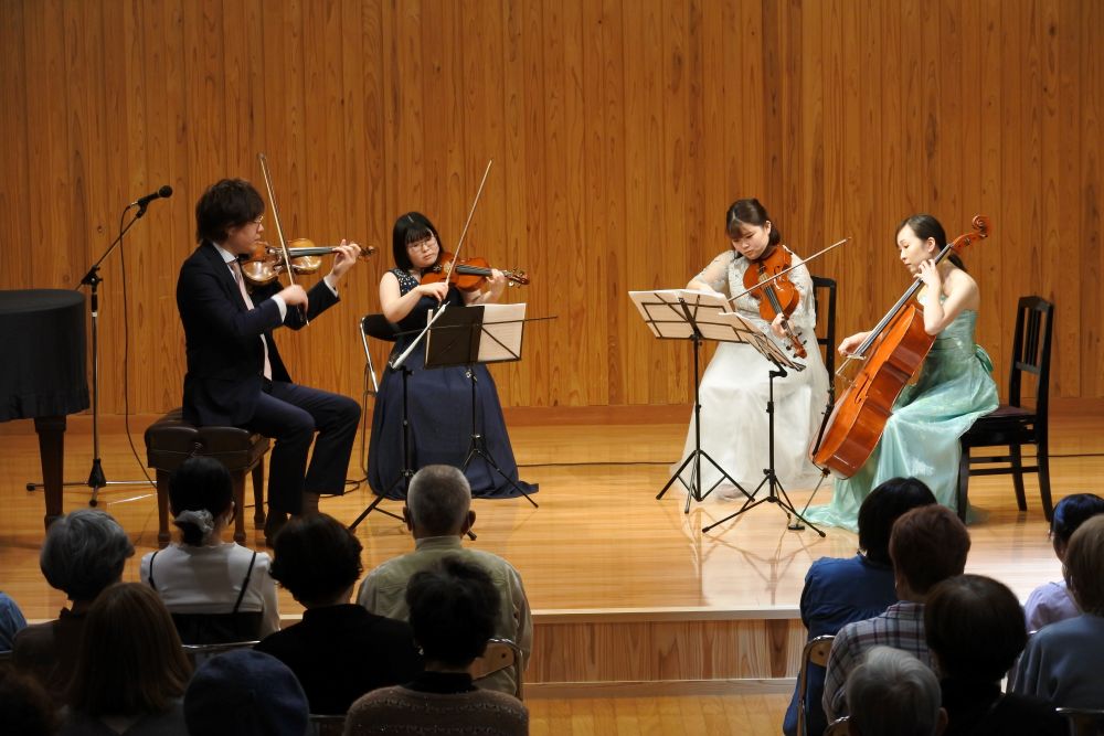 桜花の季節が過ぎ、めっきり暖かくなった4月25日(土)午後1時30分から福泊のさくら学園さくらホールに於いて“サロンドミュゼ♪とみやま”弦楽四重奏スプリングコンサートが開催されました。岡山を中心に活動されている長坂拓己さん(1st.バイオリン)森原すみれさん(2nd.バイオリン)柳原志織さん(チェロ)長谷川安美さん(ヴィオラ)による弦楽の四重奏です。