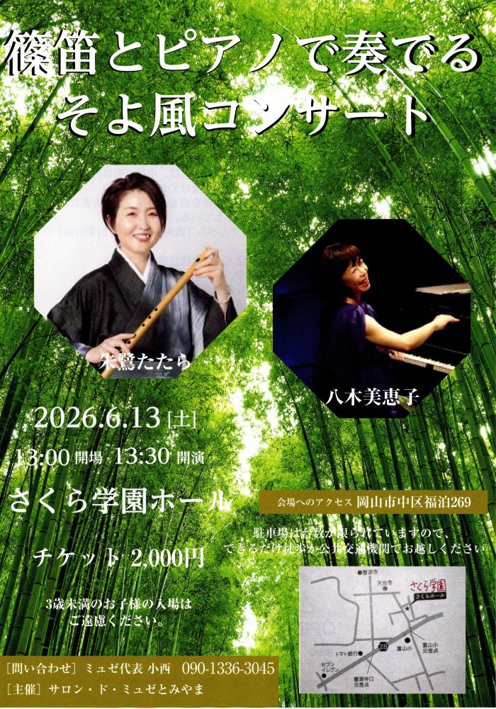 次回は6月13日(土)午後1時30分から、“篠笛とピアノで奏でるそよかぜコンサート”がさくら学園さくらホールで開催される予定です。