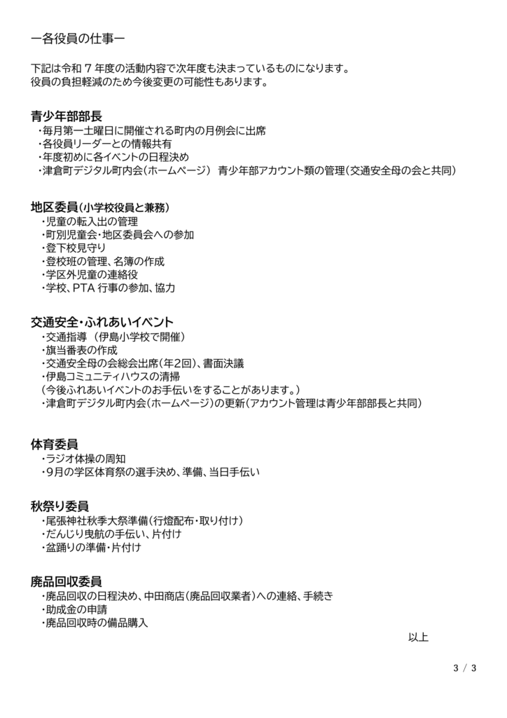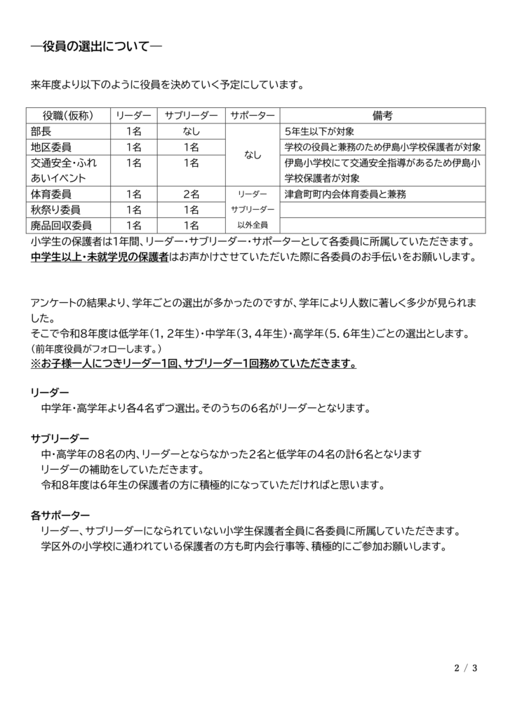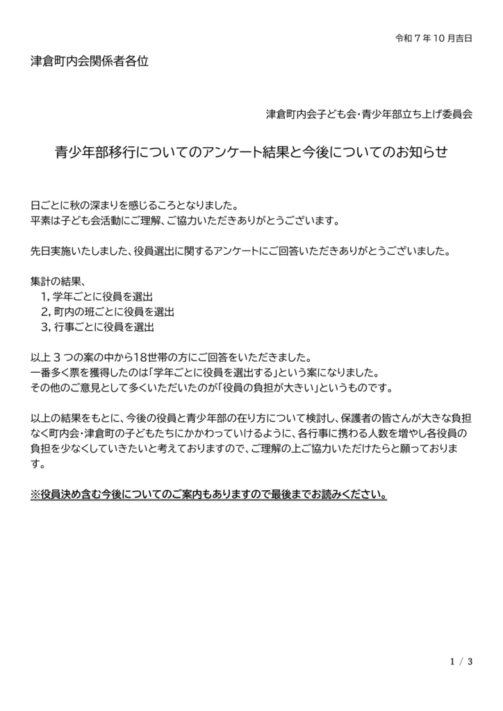 子ども会から青少年部への移行についてお知らせしてまいりましたが、町内会の皆さまや保護者の皆さまの中には、ご心配や気になる点をお持ちの方もいらっしゃるかと思います。そこで、子ども会が解散に至った経緯や、10月に実施したアンケートの結果及び役員の選出についてまとめた資料(以前に回覧板でご案内した内容)をいつでもご覧いただけるようホームページに掲載いたしました。
