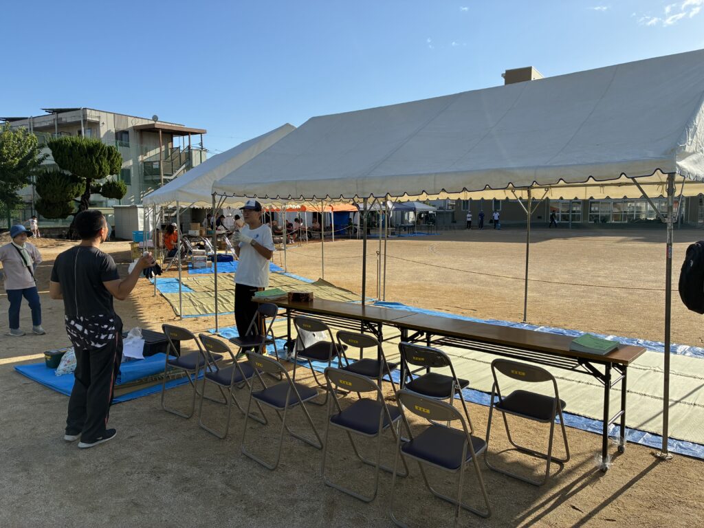 晴天の秋空の下、7時より資材搬入とテント設営を開始。