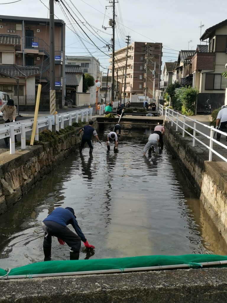 今回は、133世帯の皆様が清掃活動に取り組んでくださいました。特に、用水の水嵩が高い中、膝上まで水に浸かって藻を刈ってくださった皆様、ありがとうございます。