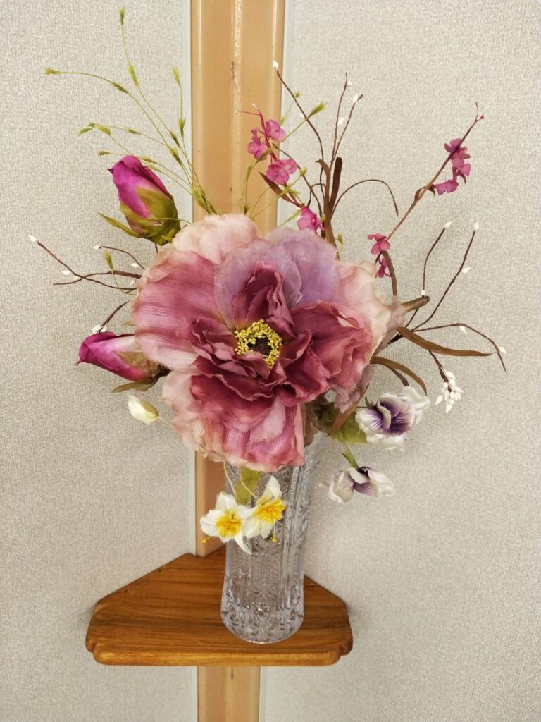 12月25日に布花教室の神吉先生が集会所にお正月のお花を飾って下さいました。