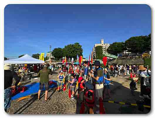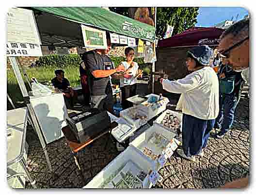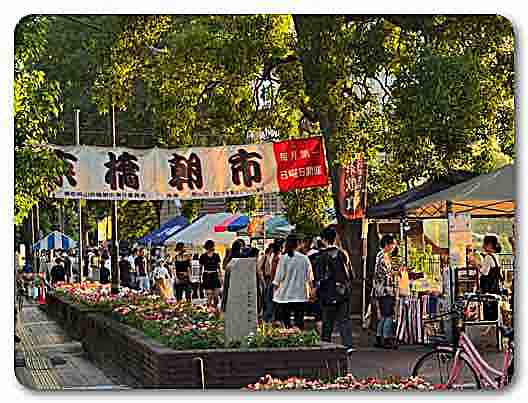 お天気は曇り雨,気温が25〜36度の模様です。旭川の河川敷と堤防上緑地では,夜明け前から午前10時ごろまで「京橋朝市」が催行されています。この催事は近隣の町内会長さんたちと有志の人たちで運営しているボランティア活動で,毎月第一日曜日に開かれて454回となります。