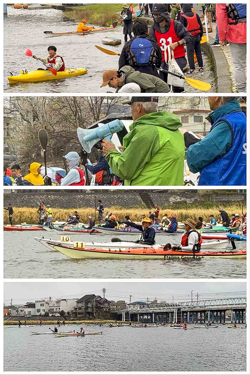 競技コースは,京橋からスタートで鶴見橋上流をUターン,京橋に戻り選手交代して京橋下流をUターン,一周約4キロを4人でチームワークを発揮してタイムを競います。午前九時半の開会式の後,競技が十一時開始,午後一時半が閉会式という進行となります。市民の人たちも水辺で応援,近隣町内会長も会場で応援や手伝いを行いました。