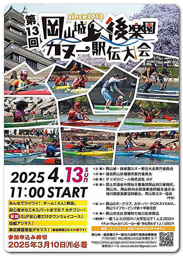 本大会は,岡山カヌークラブと周辺町内会長や町内会員そして熱心な有志ボランティア活動により実現しました。そして14年が経過して,活動本部スタッフが高齢化へ進むため,昨年からスタッフの若い人が企画して進めようということに。このようにして再開された「岡山城後楽園カヌー駅伝大会」が参加者200名を超えて盛大に行われています。