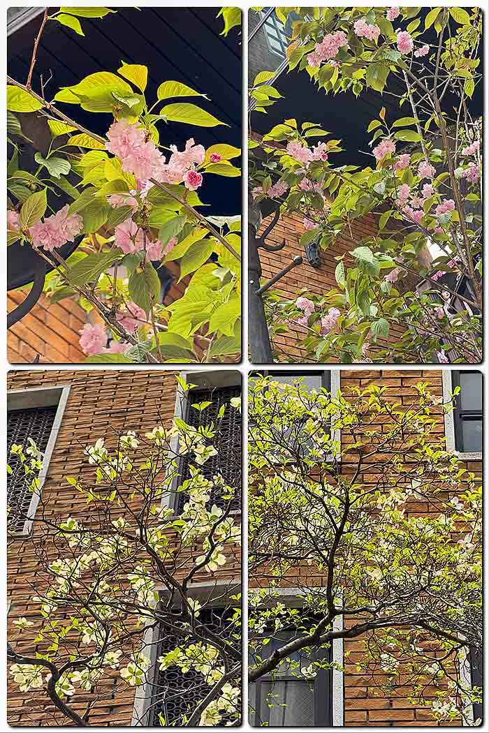 オランダ通りのハナミズキが咲きました 八重桜も満開です 2025/04/16