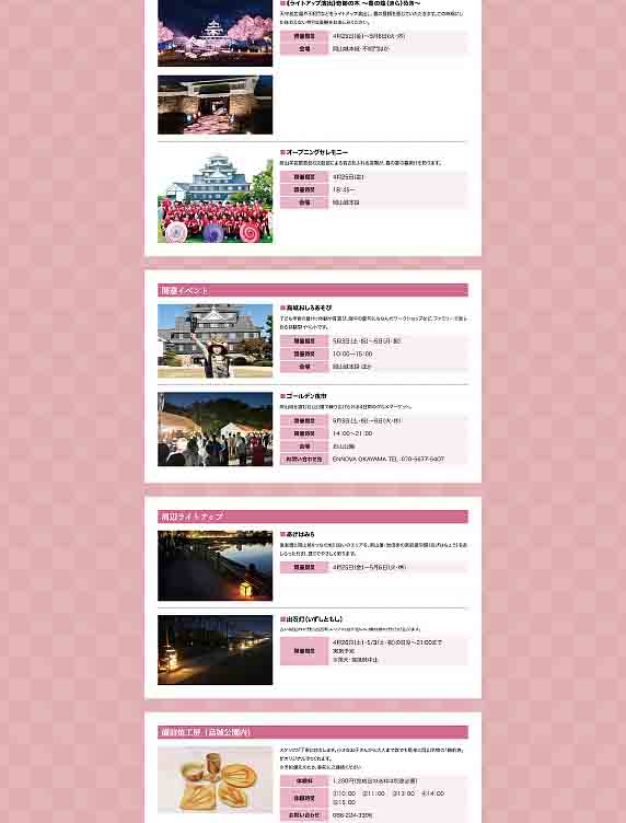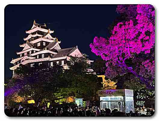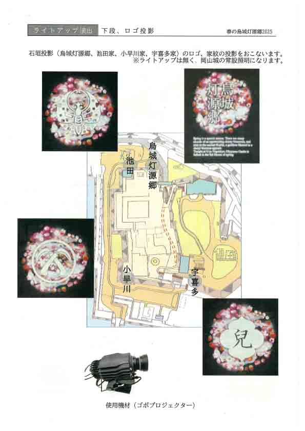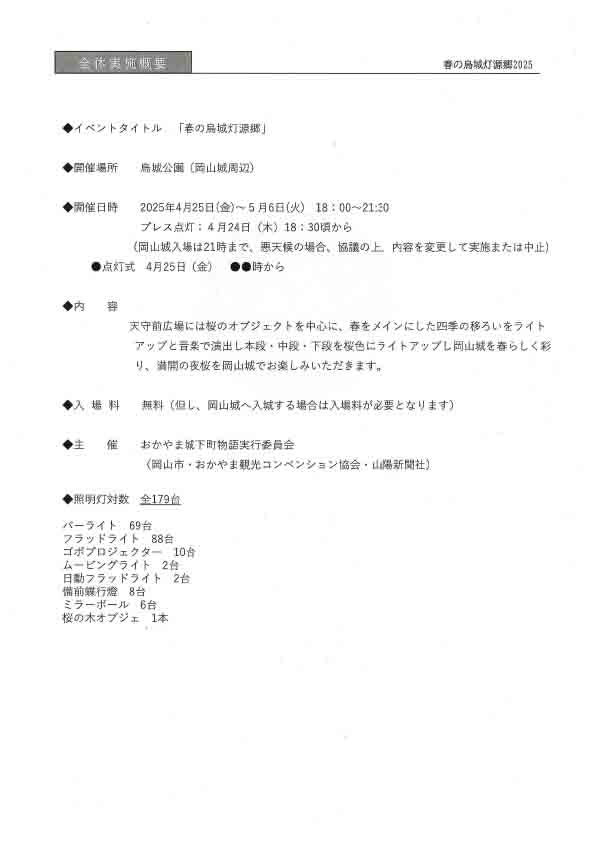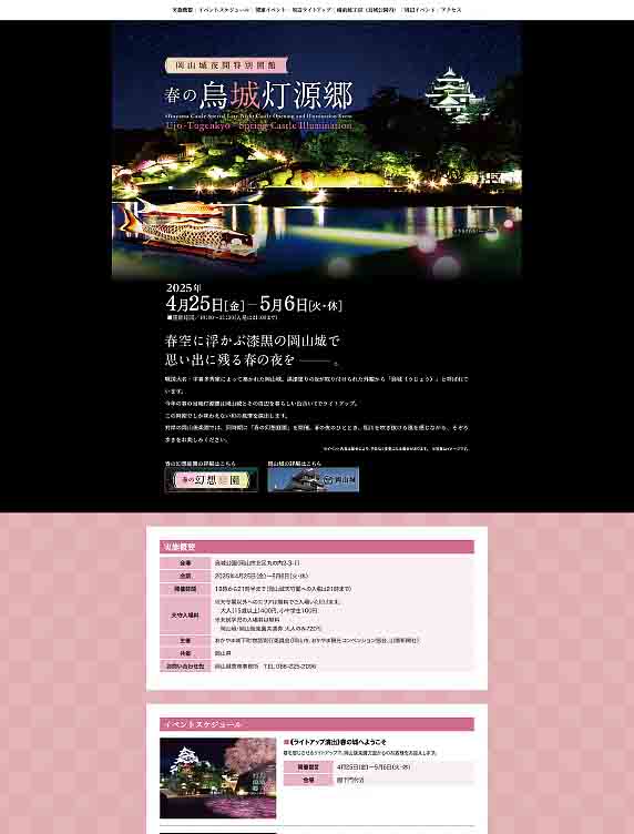 岡山城と烏城公園で午後六時から午後九時半の夜間に実施される催事は平成18(2006)年夏期に開催された烏城桃源郷が初回・第1回。その後に烏城灯源郷(2007年8月10日) へ改名,以来毎年続いています。その後には秋期開催が開かれるようになり今年も春期に行われます。