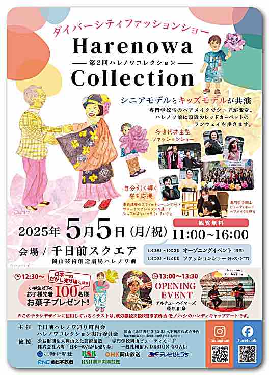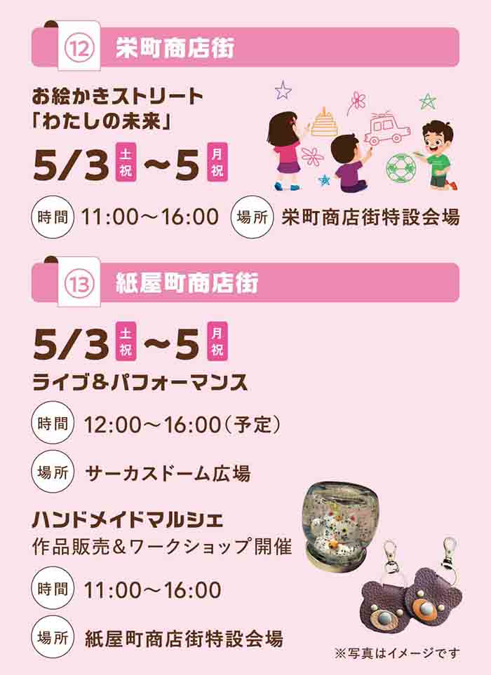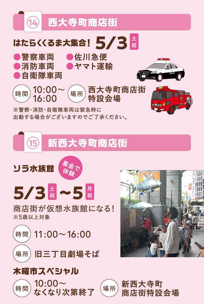 「表町ワゴンセール・各町内」「うまいもん市・上之町」「ガラポン抽選会・中之町」「キッズお絵描き・榮町」「ハンドメイド&ワークショップ・紙屋町」「はたらくクルマ・西大寺町」「ARメガネ(仮想立体視メガネ)による水族館体験・新西大寺町」(視覚に不具合や障害がある人は体験不可能)「ハレノワ・コレクション・ 千日前ハレノワ通り町内会 ハレノワコレクション実行委員会・第2回ハレノワコレクション(岡山)参加者募集中! – 朝倉真弓オフィシャルブログ 」がにぎやかに開催されます。