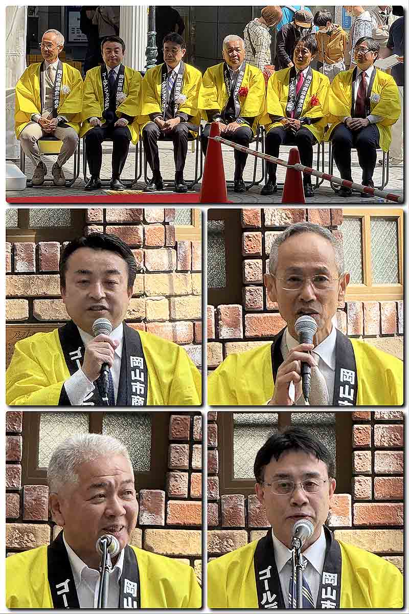 挨拶では,主催者を代表して「黒田浩一(岡山市商店会連合会会長)」,共催の岡山市は「中原健一(51)(岡山市副市長)」,続いて「梶原康彦(岡山商工会議所理事・松田 久 会頭の代読)」,「田口裕士(岡山市議会議長)」。開幕宣言は,主催者を代表して「森脇亮介(岡山市商店会連合会事業推進部部長)」が開催宣言(「只今よりゴールデンフェスタ岡山2025の開催を宣言いたします」),続いてゴールデンクロッカー祝砲を行いました。