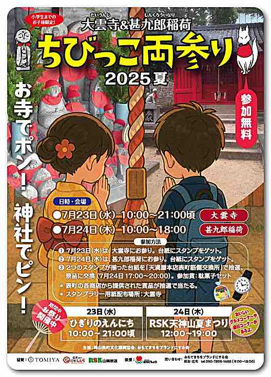 今年は新企画を行う模様です。23日が日限地蔵で大雲寺参り,24日が甚九郎稲荷参りとRSK天神山夏祭り,同時開催は両日にかけてスタンプ集めと抽選会。
