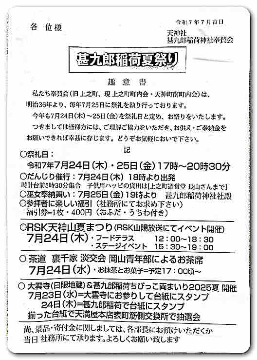 今年の「甚九郎稲荷夏祭り」について趣意書のコピーが商店街に明示されています