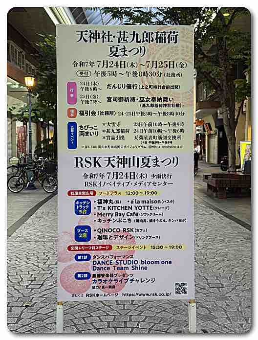 さらに新企画がポスター掲示されています。23日が日限地蔵で大雲寺参り,24日が甚九郎稲荷参りとRSK天神山夏祭り,同時開催は両日にかけてスタンプ集めと抽選会。