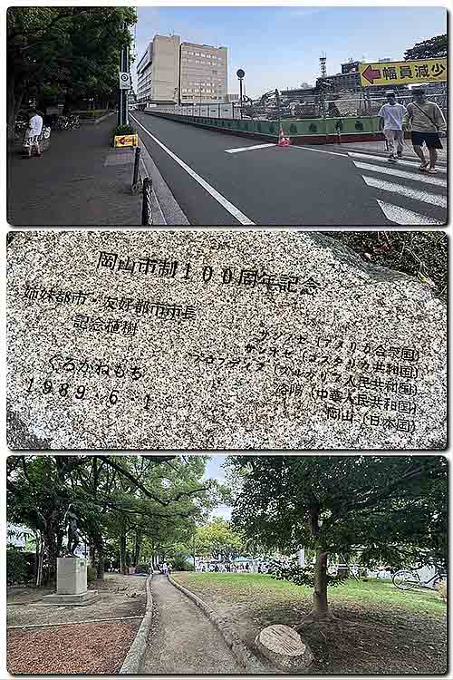 2025/08/16 上:分断する道路が通る様子(市民会館跡地公園と石山公園は一体利用不可能を示す分断道路)中:記念植樹 1989年 姉妹都市 友好都市 岡山市訪問の記念石碑   下:後方に飲食音楽演芸イベント会場
